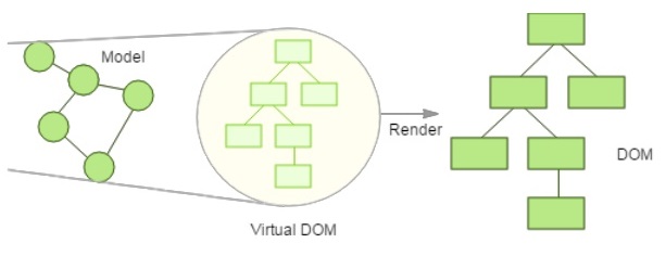 하지만 React에서 Virtual DOM은 가상의 DOM으로 브라우저에 실제로 보이는 DOM 이 아닌 메모리에 가상으로 존재하는 DOM으로 Javascript 객체이다. 그래서 실제로 브라우저에 DOM을 보여주는 것보다 속도가 훨씬 빠르다. 다음과 같이 React의 Virtual DOM은 DOM의 상태의 변화를 감지해서 업데이트가 필요한 곳의 UI를 Virtual DOM을 통해 렌더링 후, 모든 연산이 끝나면 변경된 부분을 실제 DOM에 한 번에 적용시킨다.