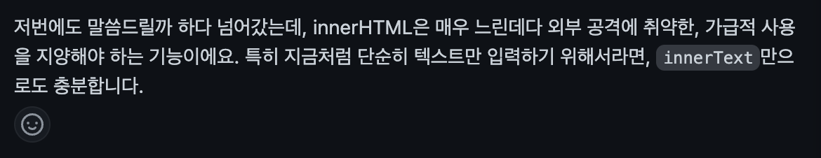 ...???innerHTML이 별로구나..처음 알았네요. 피드백을 받기 전까지는 innerHTML이 제 코딩 인생에 전부였지만, 이번을 계기로 innerHTML을 사용하면 안되는 이유와 innerHTML 속성의 대안에 대해 알아 보겠습니다.