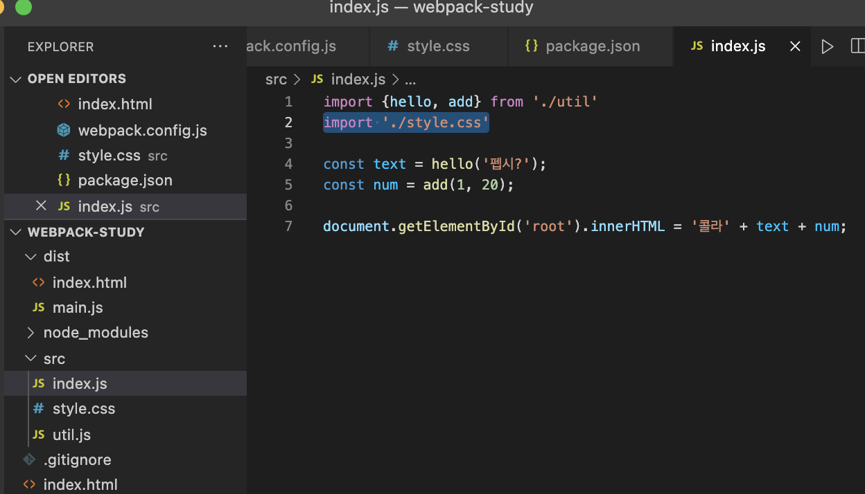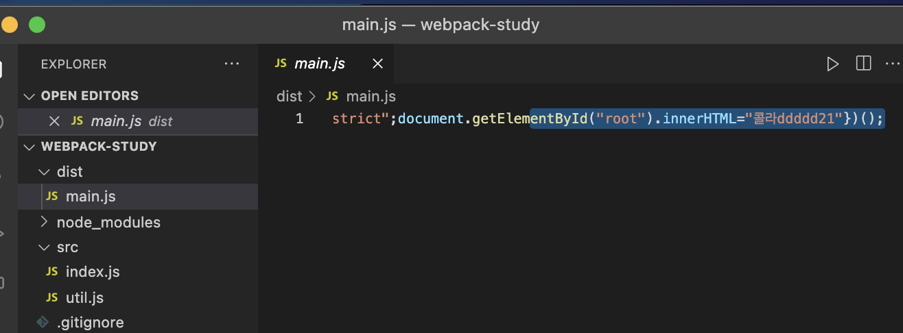dist 파일에 main.js 파일 생성된다.(index.js와 util.js 파일이 합쳐진)