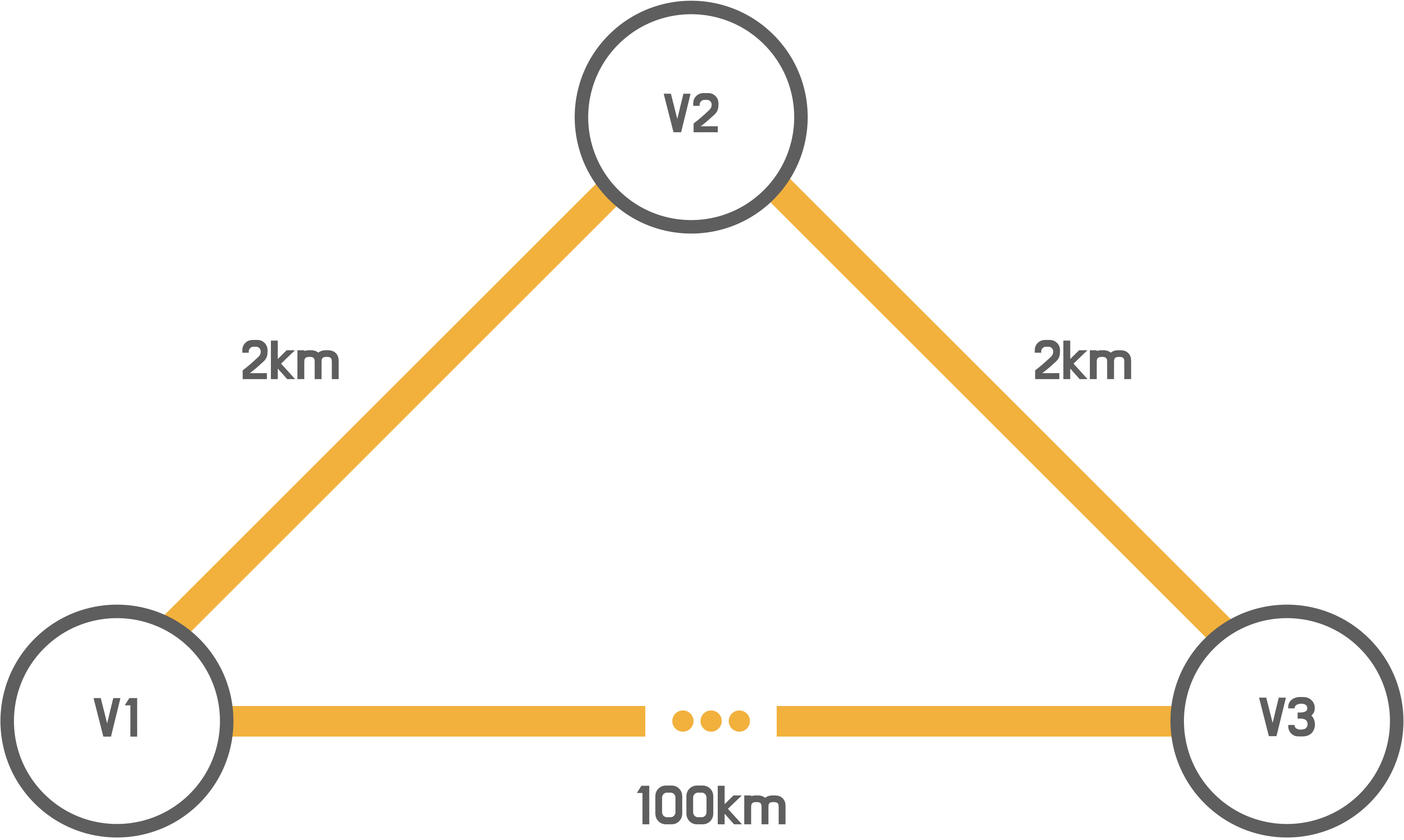 - 역 사이의 거리를 고려할 경우 V1->V3 경로의 거리는 100km, V1->V2->V3 경로의 거리는 4km이므로 최단 경로는 V1->V2->V3