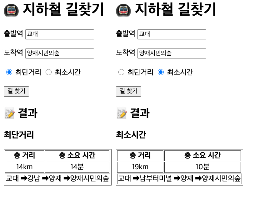 - 경로 조회 시 최단 거리 또는 최소 시간 옵션을 선택할 수 있다.