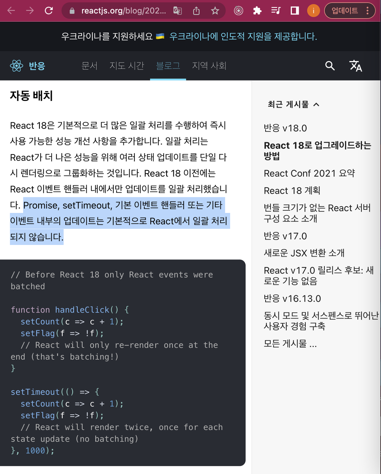 하지만, 이벤트핸들러 내부의 setTimeout는 일괄 처리 되지 않는 것을 확인 할 수 있다. React 공식문서에서도 해당 내용을 확인 할 수 있다.